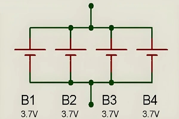 在並聯連接中,電池並排連接。這種配置保持電壓不變,但增加了容量。例如,將兩個 3.7V 100mAh 鋰電池並聯,電壓保持在 3.7V,總容量為 200mAh。當您需要延長設備的電池壽命時,此設定非常有用。