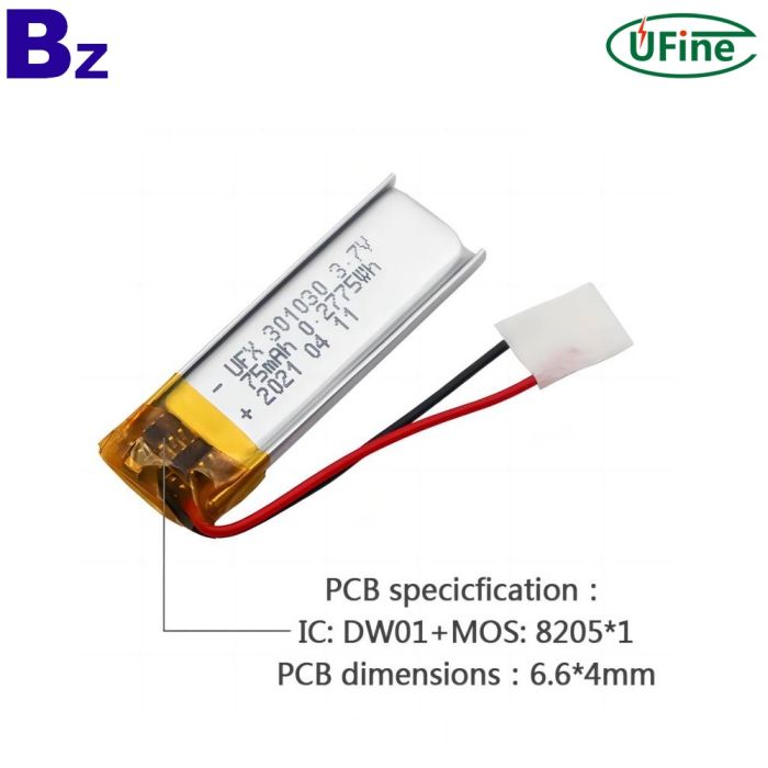 中國鋰電芯工廠批發遙控器電池 UFX 301030 3.7V 75mAh 鋰離子聚合物電池